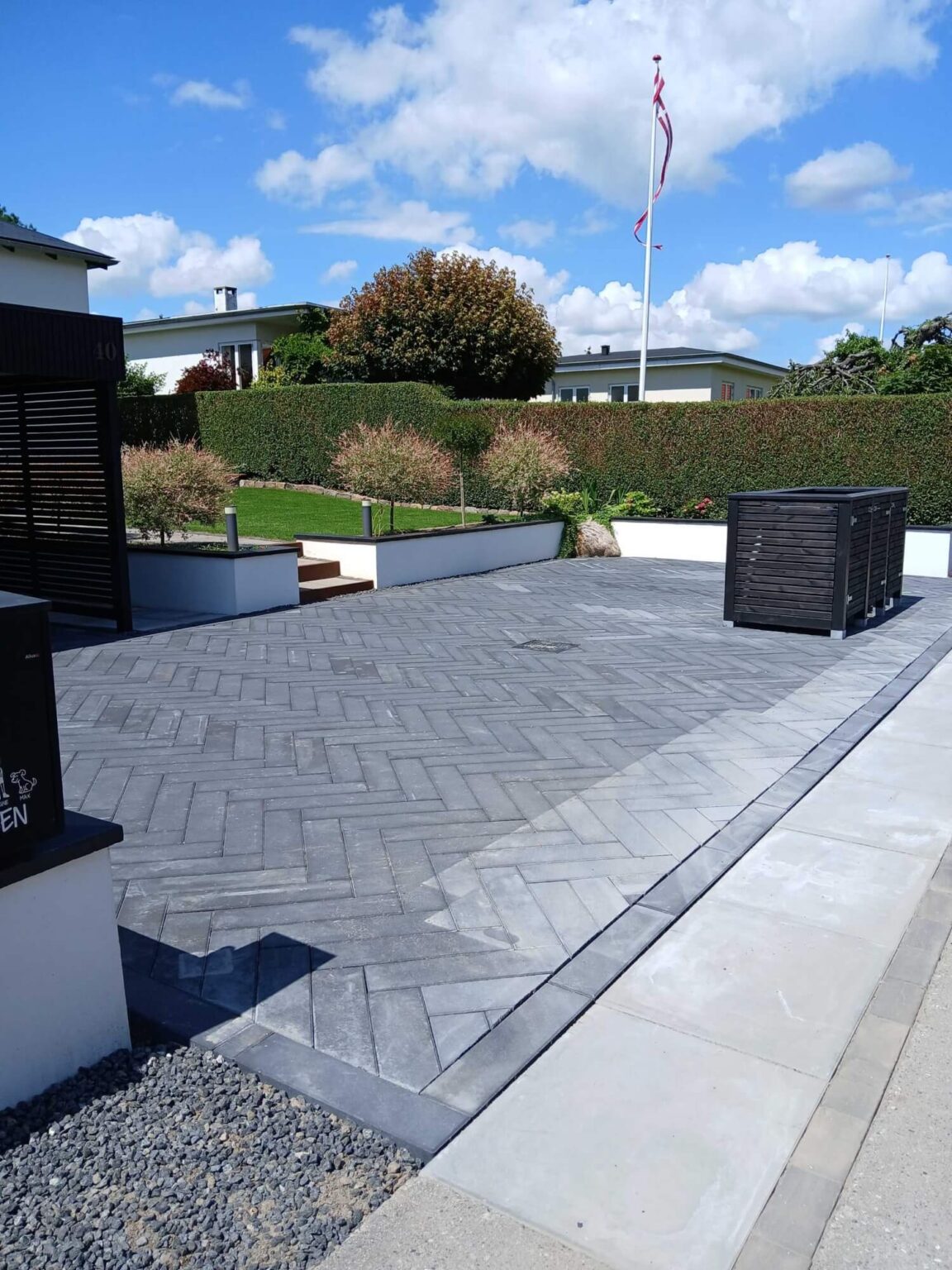 Thomas og Michael har den seneste uge arbejdet med etablering af en virkelig flot sildebensbelægning i en indkørsel. Til de mørkegrå fliser har de valgt et firkantet NID 315 mm. dæksel i komposit, som passer godt ind.